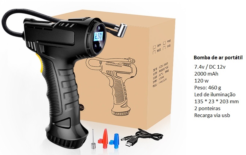 - Equipada com adaptadores para encher outros dispositivos (bolas, colchões de ar, almofadas, barcos pneumáticos, etc.)