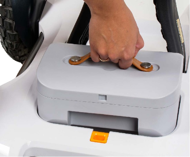 Equipada com bateria de lítio de 20 Ah que permite uma autonomia até 20 km. Bateria facilmente removível que pode ser carregada fora da scooter.